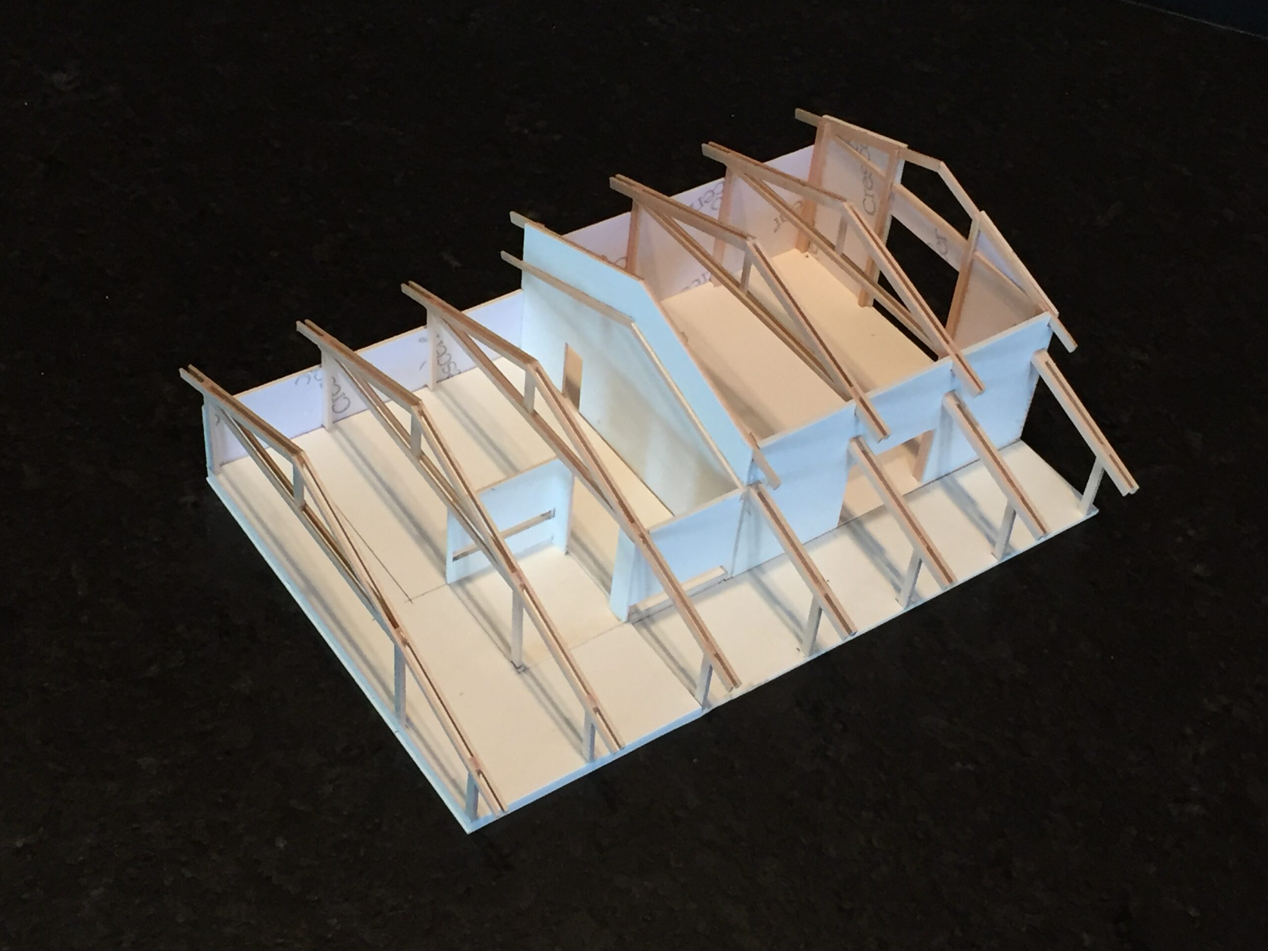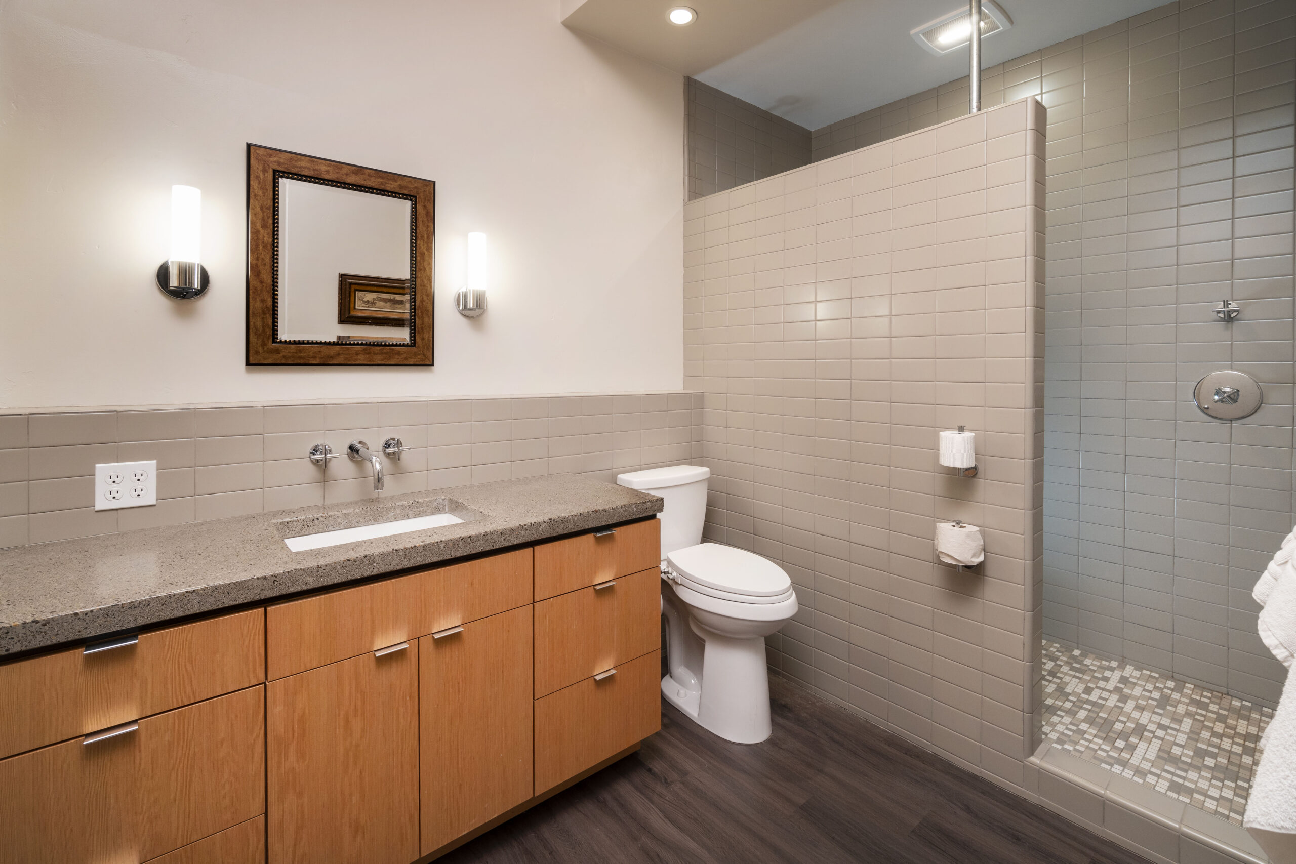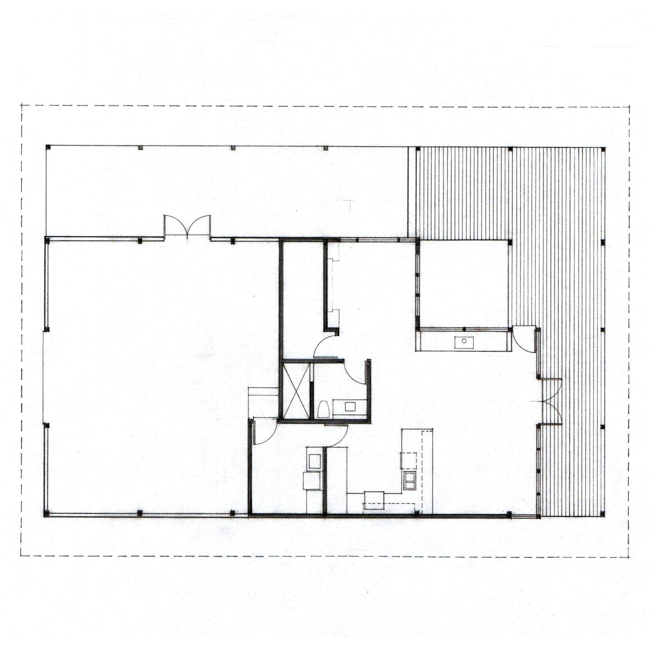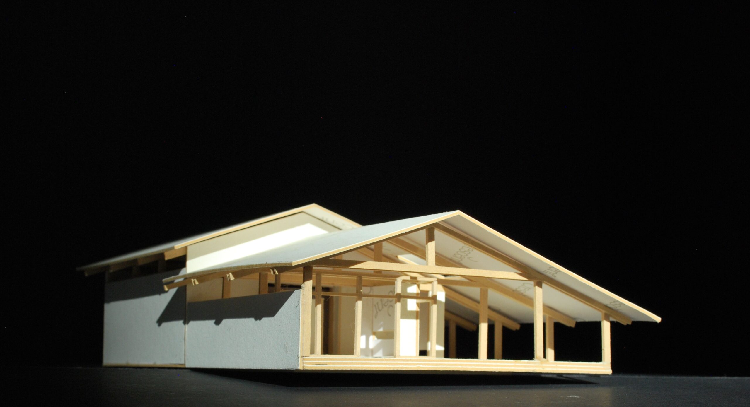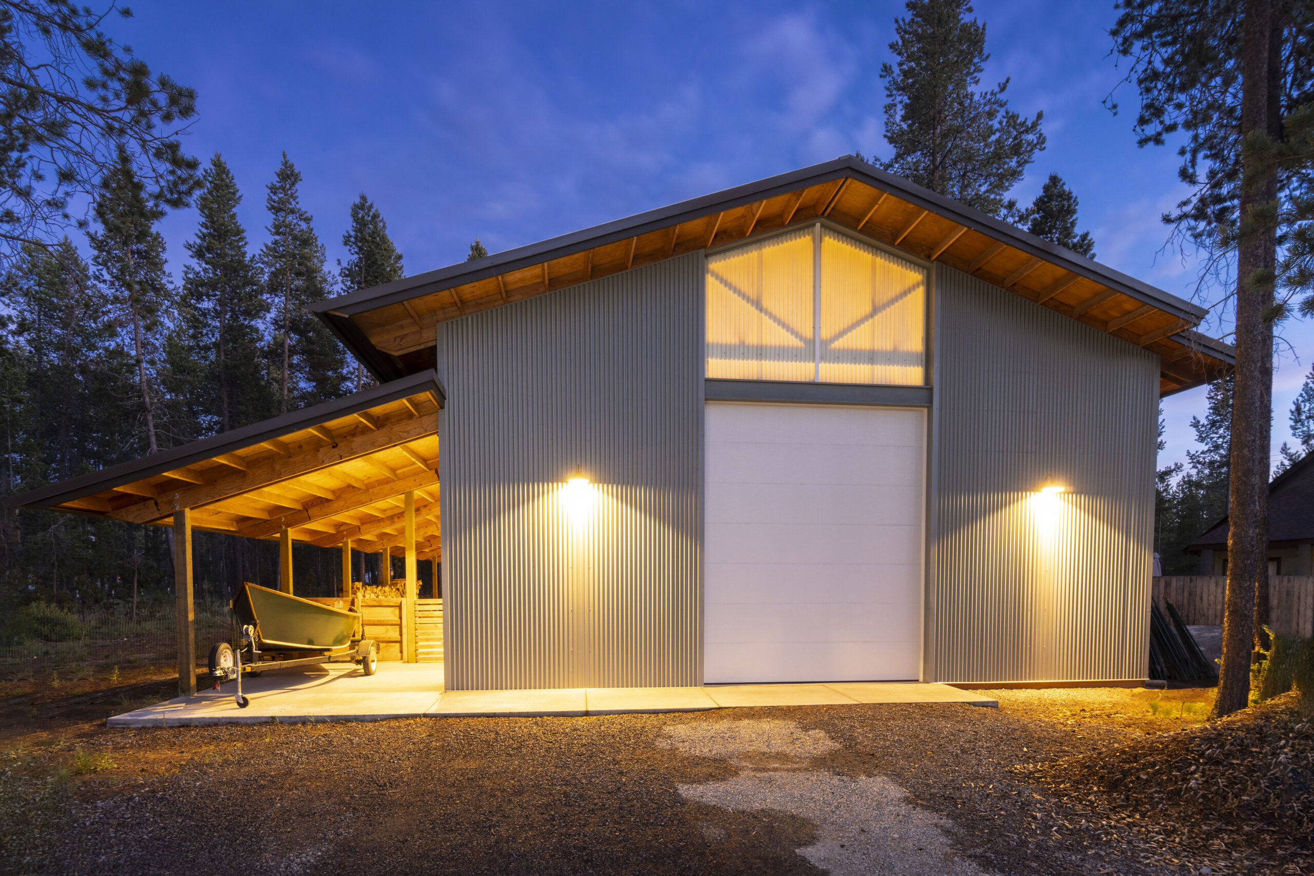 Elements of the structure, such as bolts and connection plates, remain visible on the exterior, and corrugated metal wraps around the three “barn” sides of the building. Where the residence starts, Nuetzel envisioned the corrugated metal peeling back to reveal timber-framed construction of 6-by-6 posts mortised together to form the exterior walls. The entire structure is topped with a metal roof.