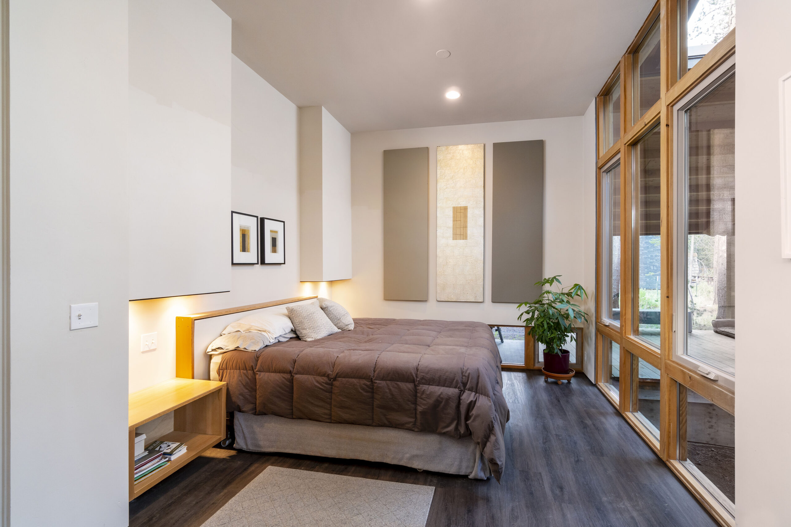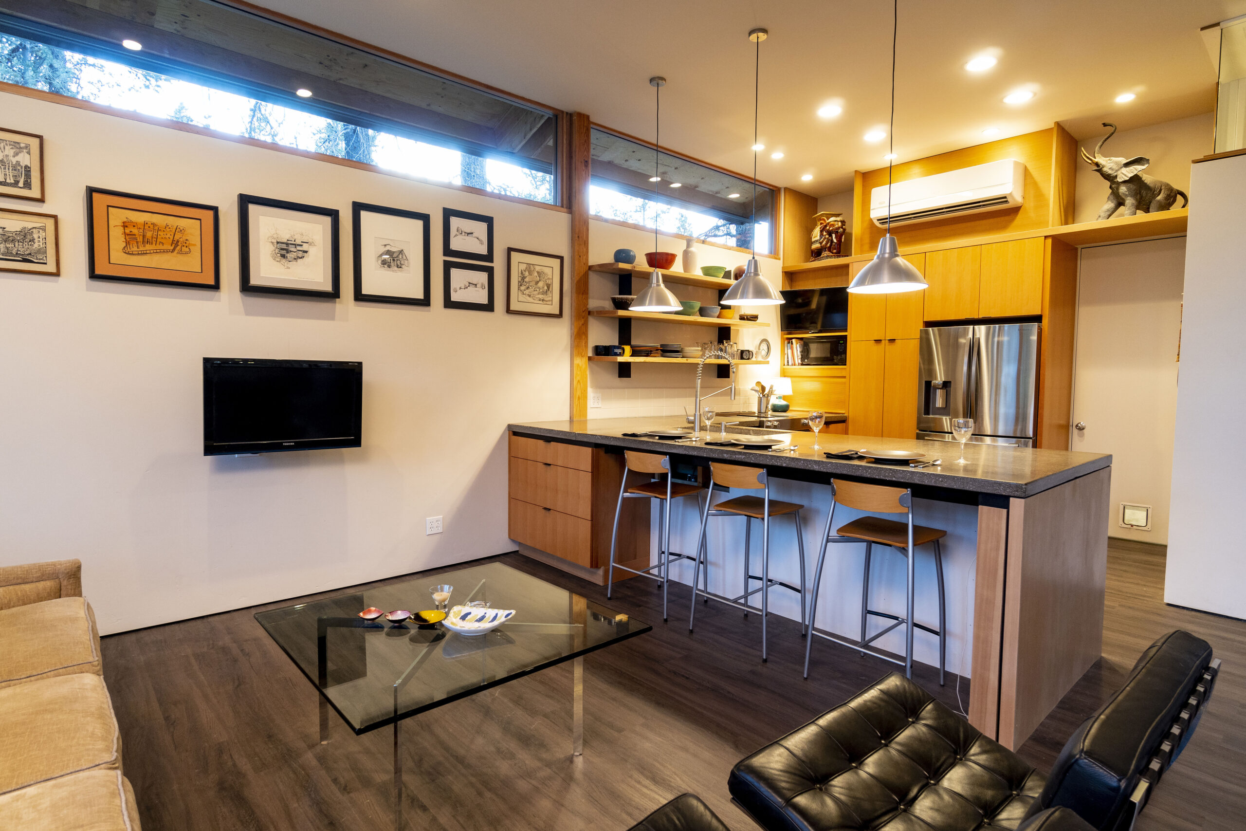 Pole-barn construction offers several advantages. It’s less expensive than stick-frame construction, a bit easier and quicker to build, and allows for wide openings that don’t require structural walls. That freedom allowed Nuetzel to create a large, open living area and install floor-to-ceiling glass on three sides of his residence that lets light pour in.